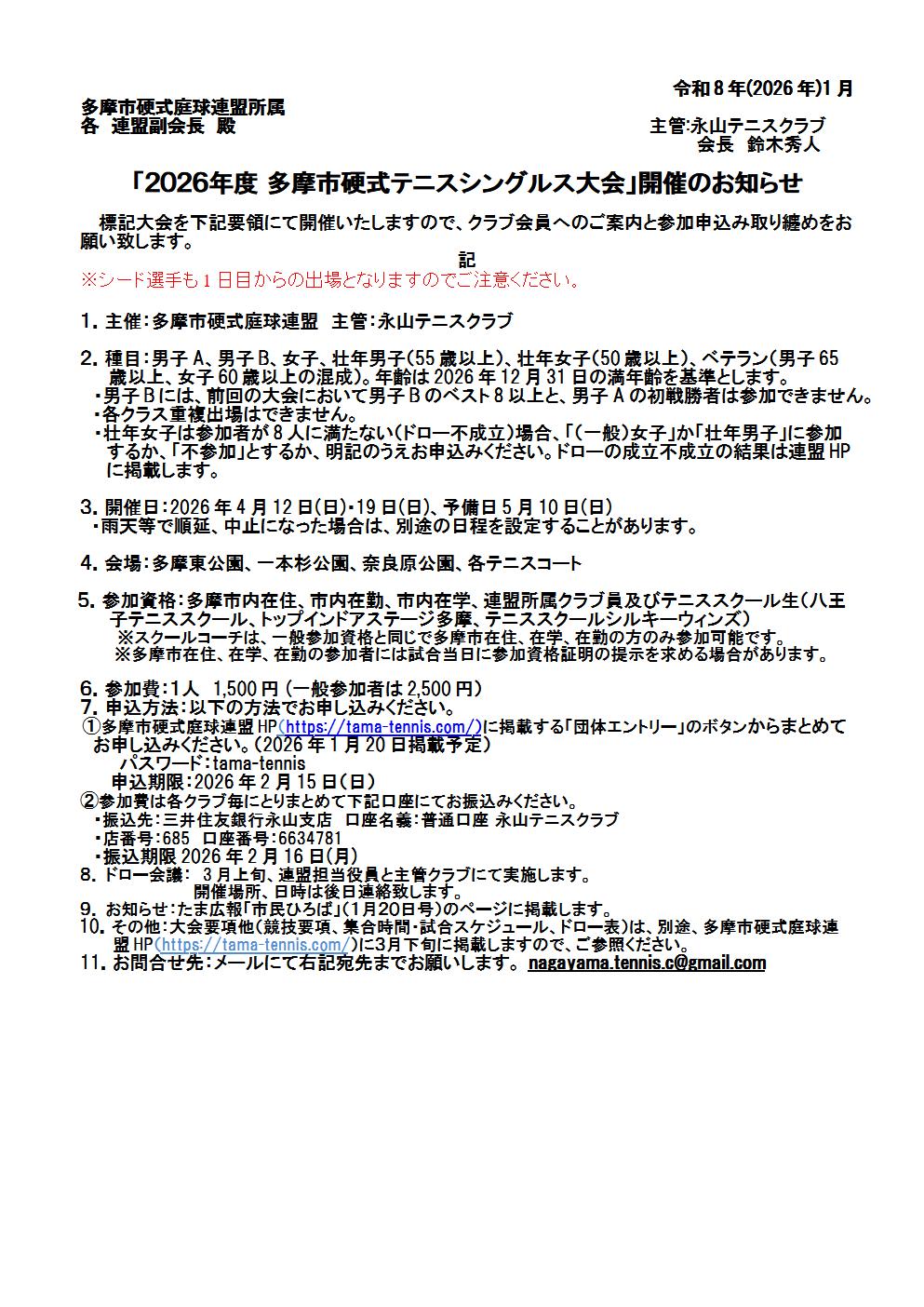 令和8年度のシングルス大会のご案内 申し込まれる方は参加費を添えて大井(takashi.oi321@ace.ocn.ne.jp)まで申し込み下さい。申込期限は2月12日です。